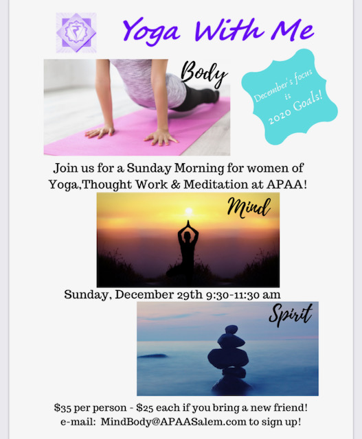 Have you worked hard all year trying to do everything you can for everyone in your life but forgot to do one of the most important thing? Do you even know what that important thing is? It is self-care!! Who is ready to take some time for themselves? Join us at A Performing Arts Academy in Salem, MA for a Sunday Morning workshop for women of pure self-care! Gentle & restorative yoga, meditation and thought work will give you the much need time for yourself that will round out 2019 and spring board you into a potentially fabulous 2020! This month’s focus will be goal setting for 2020! E-mail to register or for more questions! No experience necessary!! www.BestDayLifeCoach@gmail.com